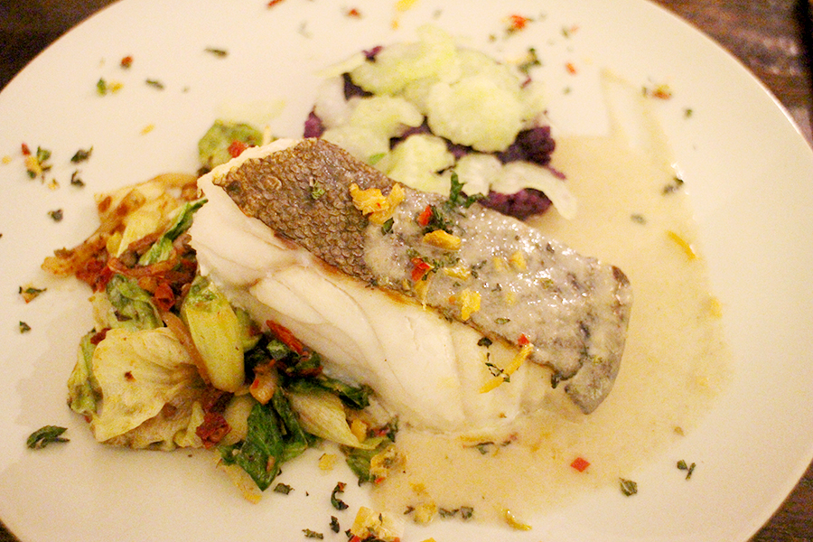 Vooraf genoten we van ‘spaghetti’ van koolraap met linzen, gedroogde pruimen en Parmezaanse kaas flakes. Niet alleen origineel, maar ook ontzettend lekker. Als hoofdgerecht werd een prachtig stukje skrei geserveerd met een saus van ansjovis, roergebakken andijvie met zongedroogde tomaatjes en kappertjes, en een bijzonder ‘cakeje’ van truffelaardappeltjes. De avond werd afgesloten met een heerlijk appeltaartje met frangipane en caramelsaus. Mmm…!