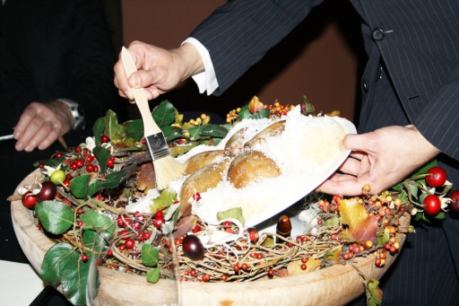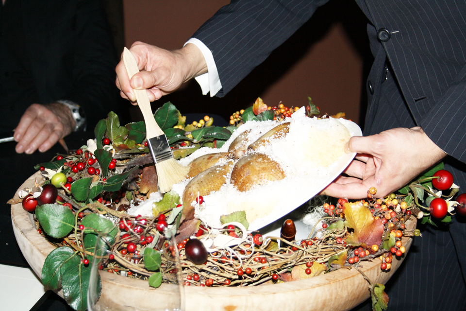 Het hoofdgerecht: Anjou duif in zeekorst met gebakken paddenstoelen en een jus van Marokkaanse specerijen Ras el Hanout. De duif moest nog uit zijn zeekorst worden getikt, wat aan tafel werd getoond.