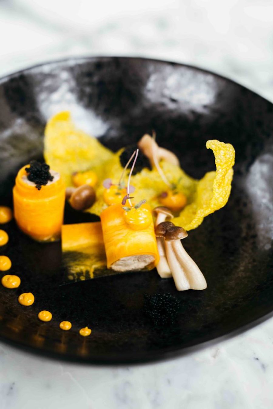 Maar ook gestoofde kalfswangen met zuurkool, witlof, bessen en knoflookjus. Of perca (vis) ‘noisette’ met een kruidenkorst, bimi en schuim van dragon.