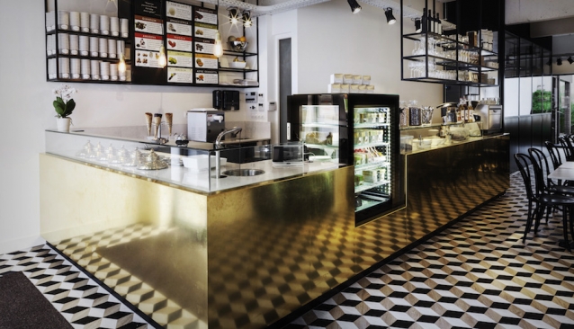 Cremerie Germaine ligt direct naast het MAS-museum in het hart van de wijk ’t Eilandje in Antwerpen-Noord. Werp één blik naar binnen en je wordt meteen zielsgelukkig: dit is ijs eten op een volwassen manier! Daarmee doelen we op een glanzende gouden toonbank, strakke zwarte rekken, zachte banken en een toffe vloer met grafische print.