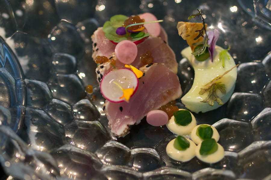Een goed begin. Nu door met de eerste gang: geschroeide Albacore tonijn. Daarbij verschillende structuren van komkommer, crème van gepofte knoflook, avocado en tapioca-kaviaar.