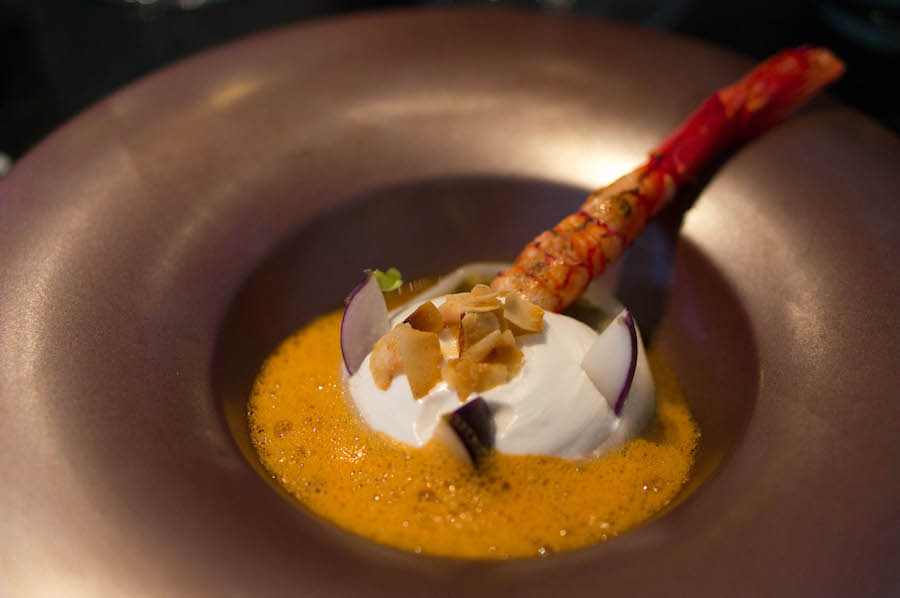 Dish numero twee: een joekel van een (knalrode) gamba met een salade van aubergine en ui. Daaromheen bisque van gamba, mousse en krokantjes van kokos en wat rettich.