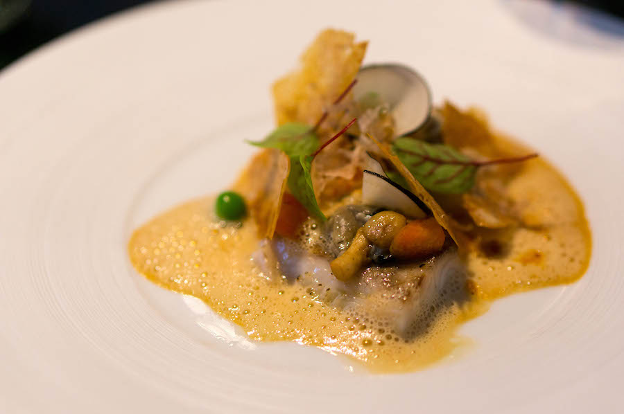 We gaan door met de derde gang vis (en je hoort ons daar niet over klagen!): zeebaars met een beurre blanc met miso. Daarbij bonito flakes, rammenas en krokante kippenhuid. En verrek: tijdens het proeven ontdekken we ook nog stukjes oester in dit gerecht.