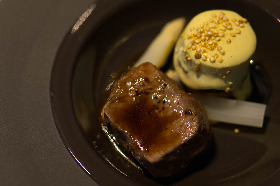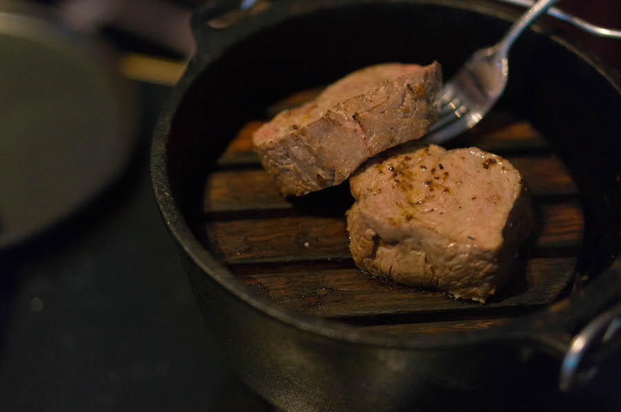 Het vierde gerecht is een spektakel: kalfsentrecote van de barbecue, die ze bij ARC serveren in een klein gietijzeren pannetje, op dennenaalden. De geur die vrijkomt zodra de deksel van het pannetje af gaat, is oorverdovend.