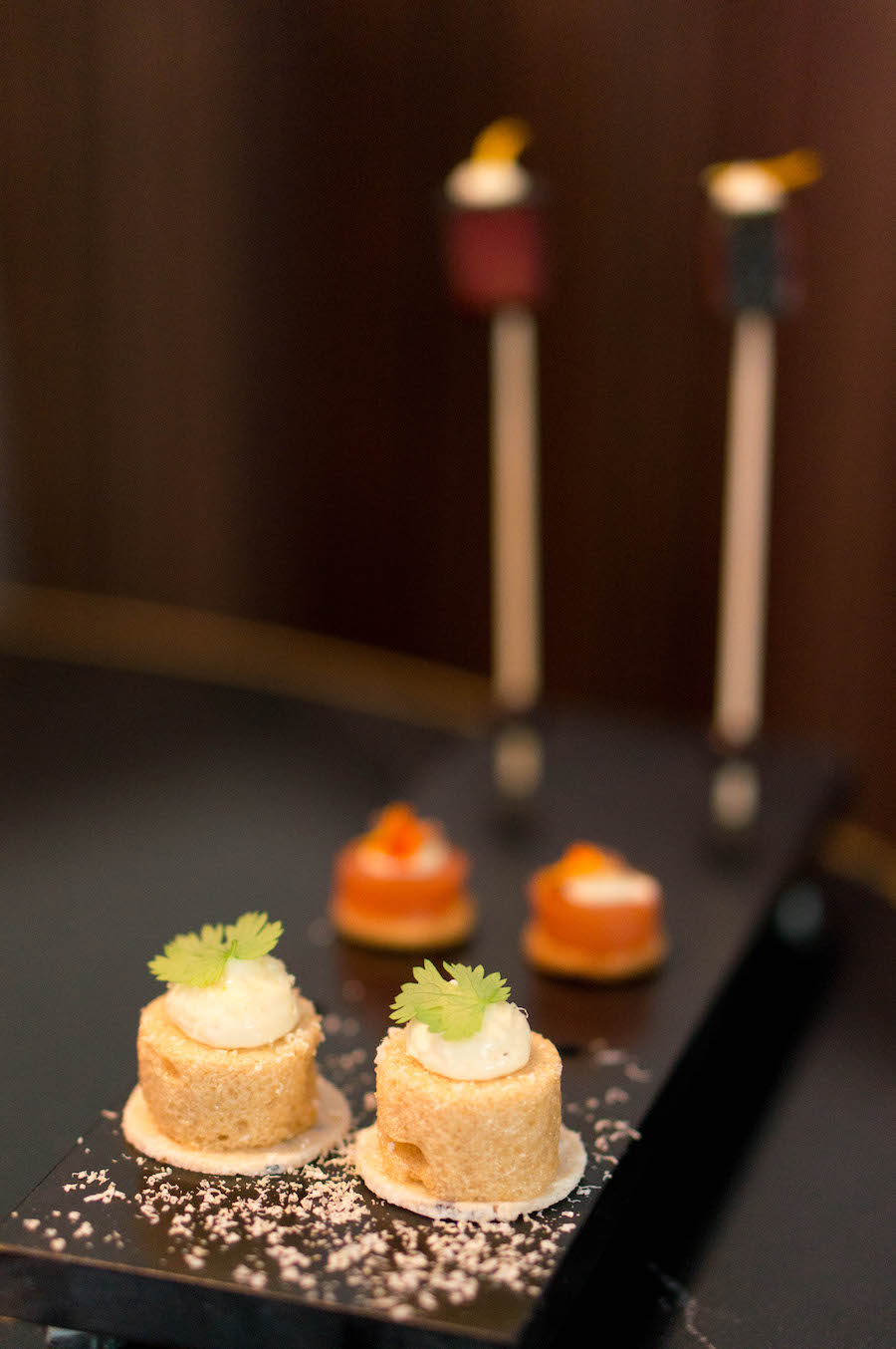 Er is een winegum-achtig hapje van gazpacho met ansjovis en een goddelijke marshmallow van kokos met wasabi en koriander. Die is zo zalig zacht, dat hij in je mond uiteen valt.