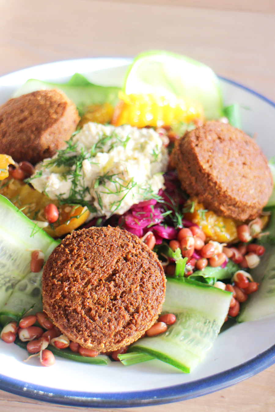 Wat ons betreft is de spinaziesalade met knapperige falafel, kiemen, komkommer, feta en artisjokdressing een echte winnaar (misschien nog wel lekkerder dan onze pita), maar we komen zeker weten terug voor die met geroosterde bietjes en een dressing van mango.