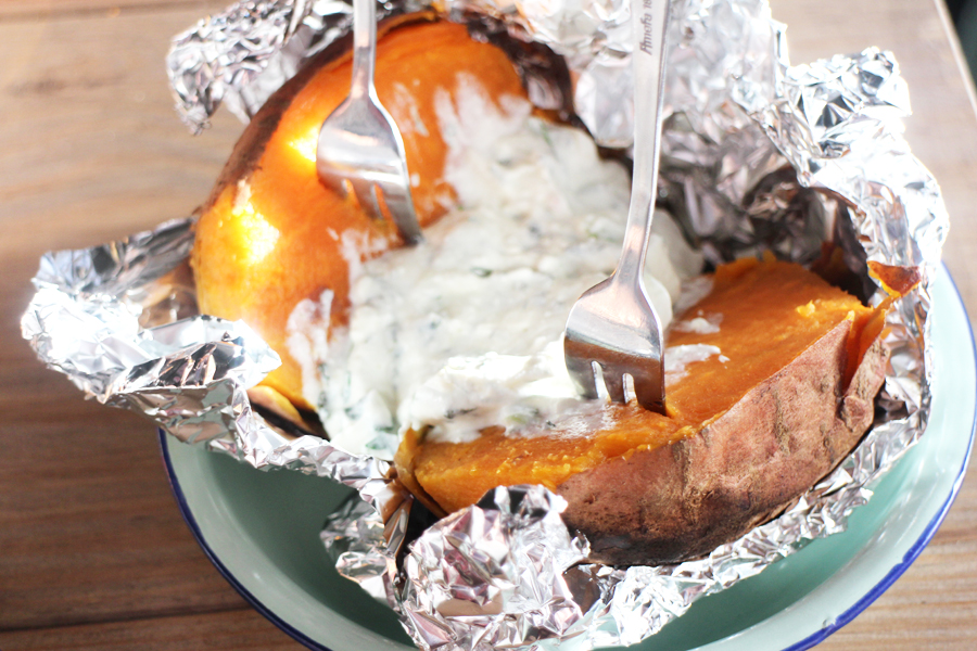 Uit gewoonte bestelden we er nog gepofte zoete aardappel met tzatziki (€3,50) bij (“op alleen een pita falafel kan je niet leven, toch?”).