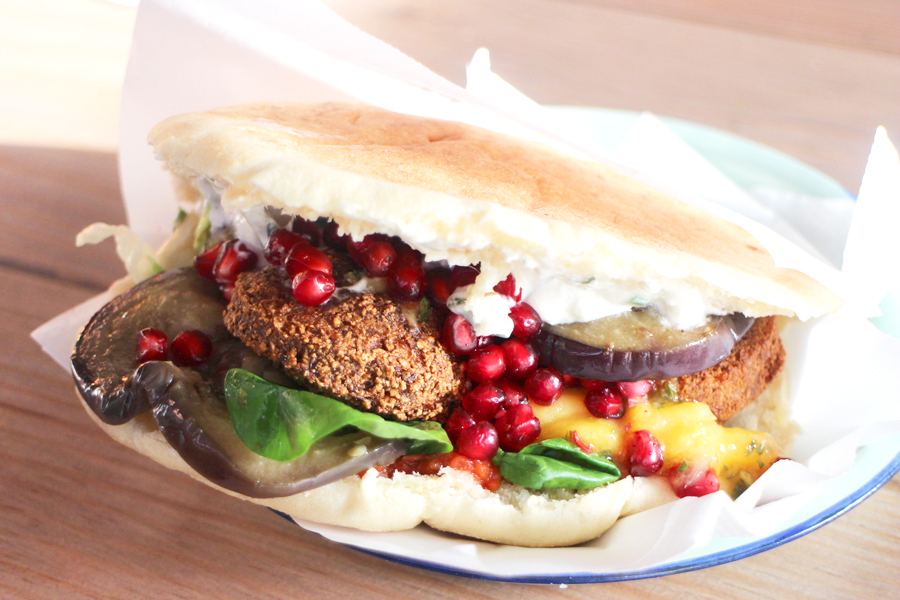 Zo genoten wij van een goddelijke pita falafel met mango, tzatziki, granaatappelpitjes en geroosterde aubergine (€7,-).