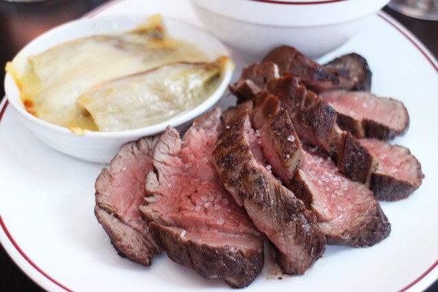 De kaart verandert regelmatig, maar je blijft de classics herkennen. Zo proeven wij de kreeftenbisque (€10,50), roulade van kip & eendenlever (€9,50) en een prachtig stuk chateaubriand (€27,50 per persoon). Erbij komen goddelijke frieten, een simpele salade en gegratineerde witlof.