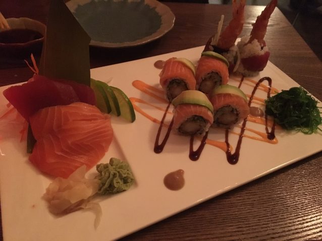 Hierna volgt een sushi en sashimi mix met erg dikke plakken tonijn en zalm: lekker! Ook de inside out maki met daarin gefrituurde garnaal en er op zalm, tonijn en avocado is smakelijk. De ratio vulling-tot-rijst is top, en de rijst is goed op smaak en temperatuur.