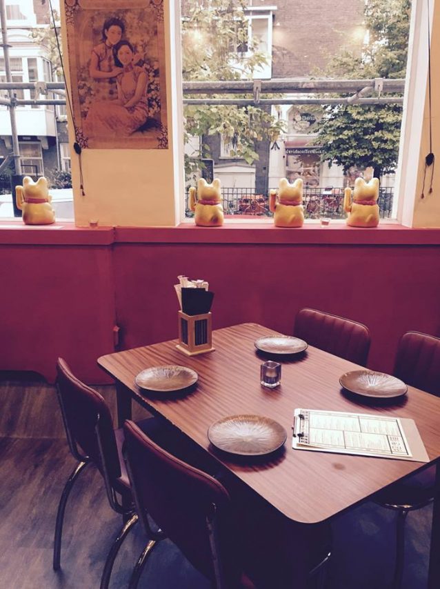Bij binnenkomst valt meteen de quirky inrichting op. Het lijkt alsof we in een soort kruising tussen een bruine kroeg en een kitscherige Chinees zijn terechtgekomen. De muur waar we tegenaan zitten, is behangen met affiches van Aziatische strips, wat dan weer een beetje een hipster gevoel geeft. Een hele unieke combinatie, en eigenlijk vinden we het best wel leuk.