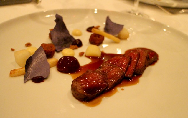 Het hoofdgerecht bestaat uit hertenrugfilet met rode kool, peer, pastinaak en mini-wentelteefjes van kruidkoek. Het vlees is perfect gegaard, de jus heerlijk stroperig en het garnituur (met name de stukjes peer) past er perfect bij.