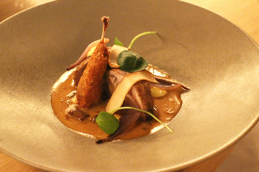 De gevulde kwartel wordt geserveerd met een knapperig pootje, foie gras, king boleten en morieljes, en het gerecht van melkkoe bestaat uit plakjes ribeye, een bitterbal, draadjesvlees en eigen saus.
