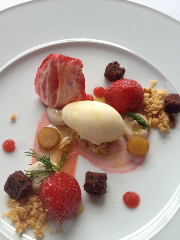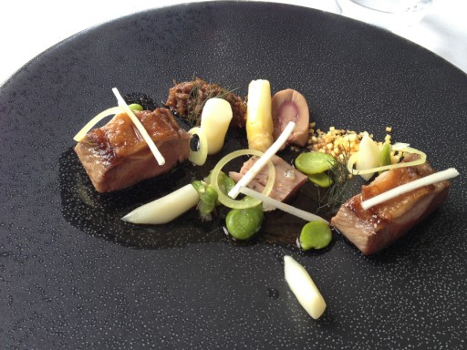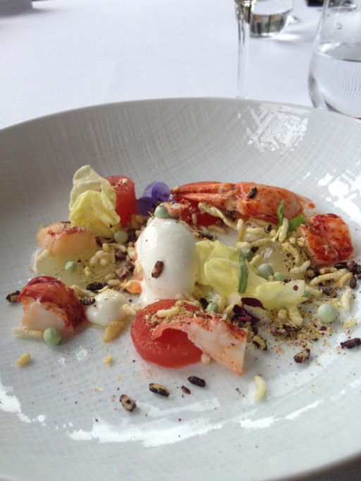 Het eerste “echte” gerecht was zachte kreeft met yoghurt, watermeloen en cruesli van gepofte rijst, dragon en biet. Niet alleen zag het bord er spectaculair uit, de smaken waren fenomenaal! De watermeloen paste precies bij het zoetige van de kreeft, wat door de yoghurt weer in balans werd gebracht, en dan de cruesli.. Zó origineel en de perfecte toevoeging.