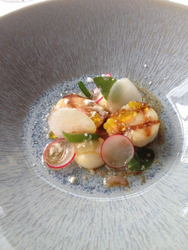 Van tevoren hadden we uiteraard even gespiekt op de menukaart. “Wat zullen we krijgen? Ik hoop de coquilles! En het lam… En.. Nou eigenlijk ziet alles er lekker uit!” Tot onze grote blijdschap kregen we de coquilles, en màn: wat kan Alain koken! Wederom perfect in balans met dun geschaafde radijsjes, mierikswortel, grapefruit en… Olijfoliekaviaar! We zien de gouden balletjes steeds vaker voorbij komen, en terecht, want ze geven net dat beetje extra qua smaak & gevoel.
