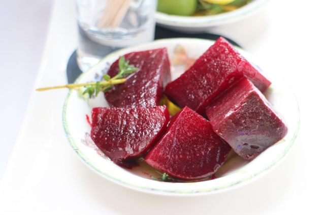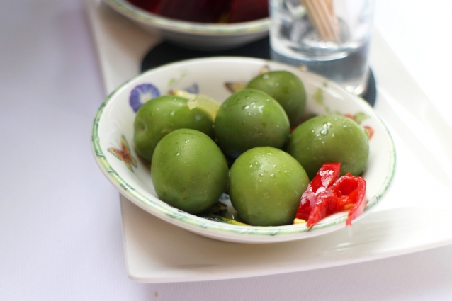 Tijdens het neuzen in de kaart krijgen we een schaaltje olijven en wat stukjes biet.