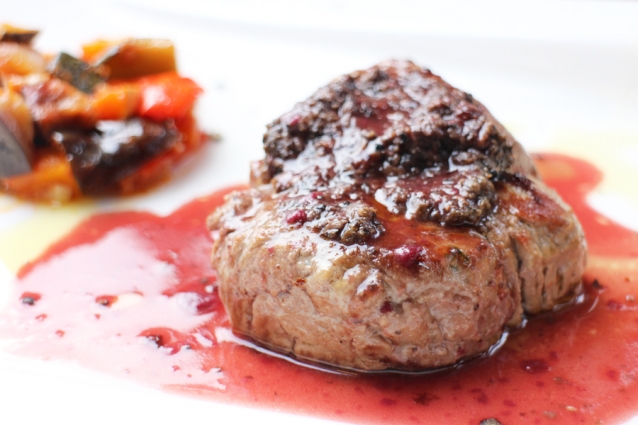 Het vlees is lekker, maar aan de stevige kant. Iets wat je bij ossenhaas niet verwacht. Daarbij zijn de gebakken aardappeltjes veel te vet, al maakt de perfecte caponata die erbij wordt geserveerd heel veel goed.