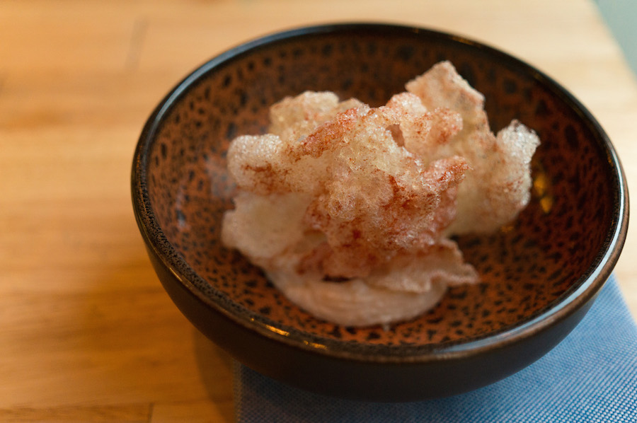 De ‘kroepoek’ die erbij zit, is gemaakt van runderpezen. Volgens de chef kost het héél veel tijd om het te maken, maar wat een toffe techniek! Nose-to-tail eating op z’n best.