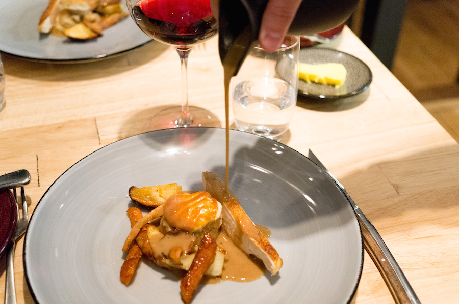Chef Graham komt aan onze tafel om het hoofdgerecht te serveren. “Dat moet bij ons een beetje grof zijn, zoals een roast dinner“, zegt hij. Op ons bord vinden we een prachtig stukje boerderijkip met een mini chicken pie, geroosterde bospeen, pastinaak en meiraap, gebakken stekelzwammen en een jus van foie.