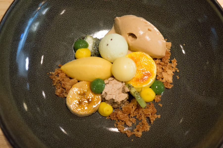 Het dessert bestaat uit kiwi, gekarmeliseerde banaan, mango, passievruchtenijs en ananas, met een mousse van groene curry, cake van koffie en kokos en ijs van pinda’s. Ook zit er een gel met een klein beetje kerrie bij. We zijn dol op de combi zoet-met-zout en de hartige smaken van het pindaijs, de kerrie en de koffie maken dat je dit dessert in één zucht dooreet.