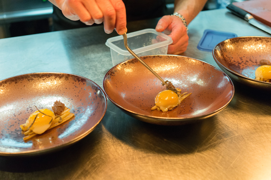 Gang drie: dooier van eendenei gegaard in rookolie, schorseneren gebakken in salieboter, crème van gefermenteerde knoflook, crumble van hazelnoot en jus van kombu.