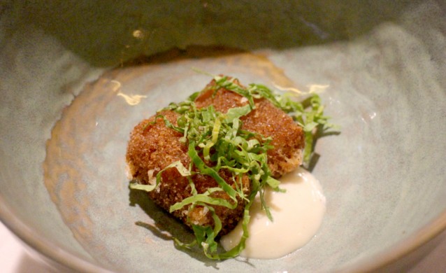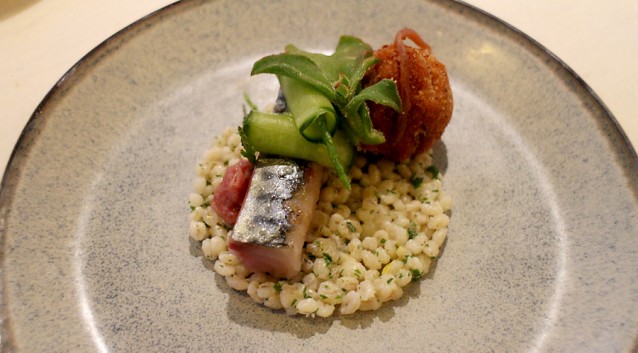 Zo beginnen we met een mini kroketje van varken, rillettes van varken en een prachtig bordje met parelcouscous, citroen, rauwe makreel, komkommer en krokante kalfshersenen. Dat laatste klinkt enger dan het is, en als we alles bij elkaar proeven zijn we bijna in extase.