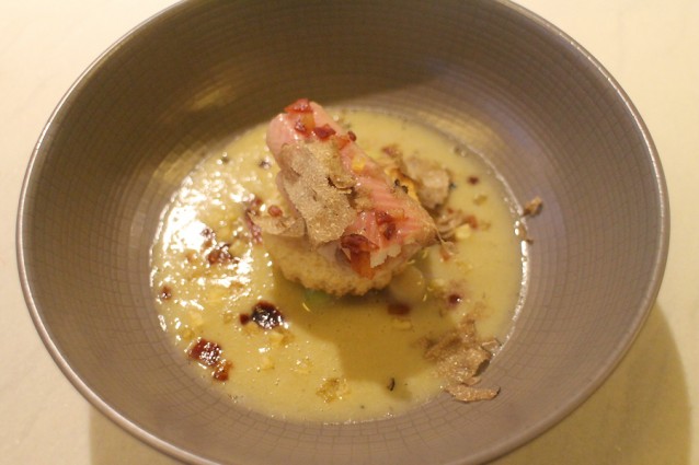 Als tussengerecht staat er gerookte paling in vichyssoise (een romige aardappel-preisoep) met spek en verse zwarte truffel op het menu. De combinatie van de rooksmaak van de paling met het zoute spek en de zoete prei is zalig en ook dit gerecht is binnen een paar minuten op.
