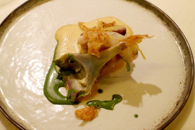 Dan volgt het gerecht waar we ons al de hele avond op verheugen: rauwe langoustine met artisjok, langoustinesaus en dragoncrème. Hoewel de smaken ontzettend goed zijn, missen we het zout op tafel en is de saus helaas al op voordat het bordje leeg is.