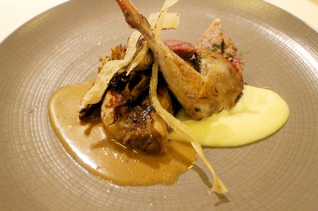Het eveneens heerlijke hoofdgerecht bestaat uit patrijs met een stukje venkelworst van wild zwijn, spitskool, paddenstoelen, crème van schorseneer, een toastje met merg en albuferasaus (een saus op basis van gevogeltefond).