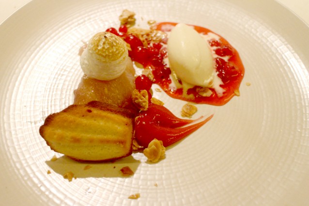 Tot slot sluiten we de avond af met een – anders dan de meeste gerechten – fris nagerecht van wilde perzik, meringue, ijs van vlierbloesem, aalbessen en een madeleine. In één woord: perfect. Niet te zwaar, niet te zoet en weer zó lekker dat we snakken naar meer.