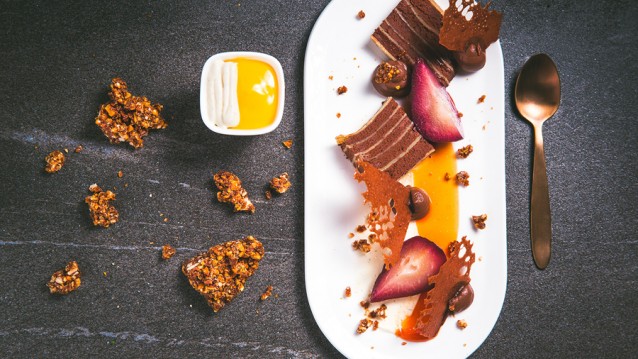 Verder gaan we met de lamslende met verse tuinbonen en aardappelmousseline (€15,-) en de vis van de dag. In ons geval is dat een stukje zeebaars ‘die zwemt’, met onder andere witlof en een soep van postelein (€15,-).