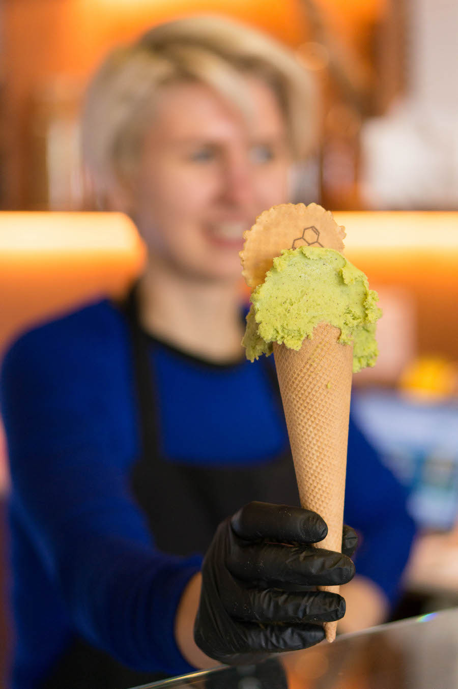 “Het draait om speelse smaken en een speelse ervaring”, vertelt eigenaresse Ola ons. Zij runt de salon samen met haar partner Vladimir. Ze heeft een bijzondere achtergrond: ze is beeldend kunstenaar. Daarnaast heeft ze een passie voor gastrofysica, neurogastronomie, onderzoek naar perceptie én lekker ijs. Al die ingrediënten stopte ze in de ijssalon.