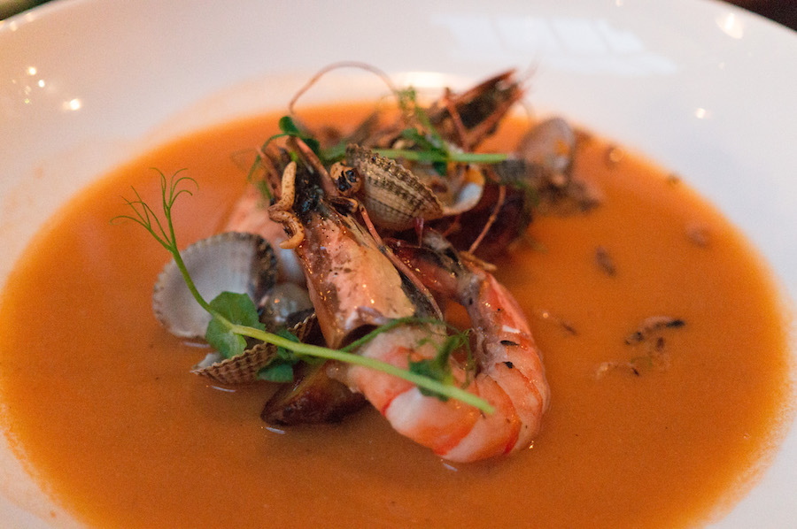 Onze tweede gang bestaat uit gamba’s en kokkels met paella, gepofte wilde rijst en aardappelpartjes. Daarbij wordt een feloranje bouillabaisse geschonken.