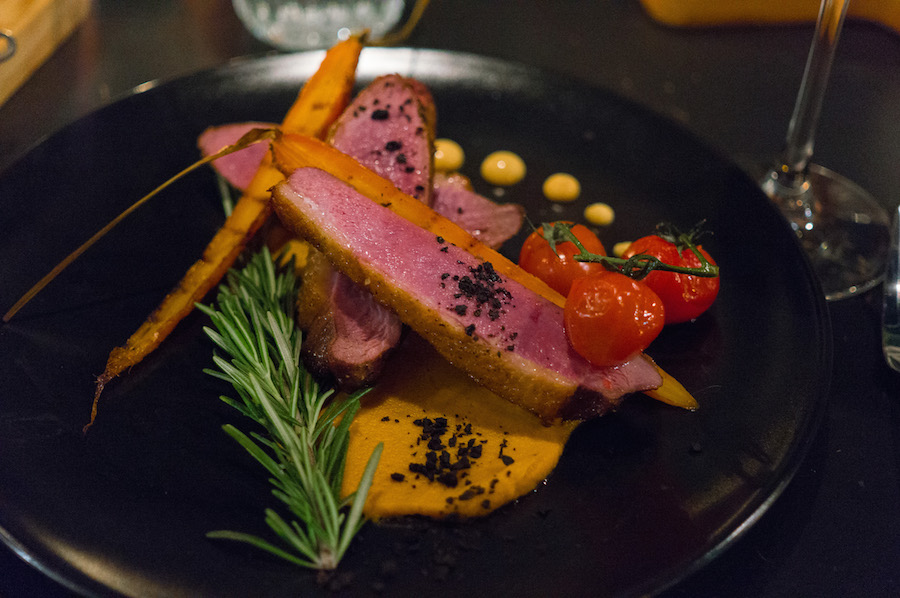 Voor ons hoofdgerecht wordt ons tafeltje feestelijk gevuld: we krijgen een bordje met daarop eend en peen, mayonaise met tom yam-kruiden, gepofte tomaatjes en wederom de crumble van zwarte olijven. Daarbij zet de chef altijd wat bijgerechten op tafel, wordt ons verteld. In dit geval: lekkere aardappelpartjes in de schil, gepofte tomaatjes en wortels.