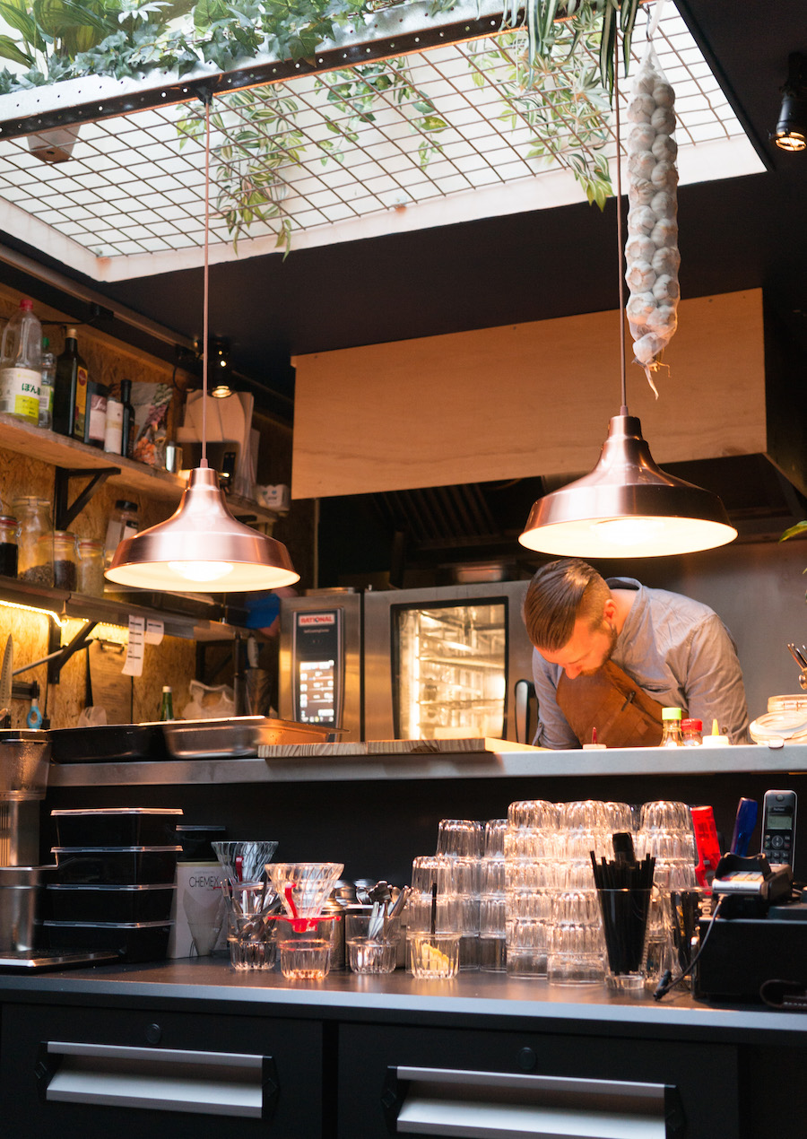 Er zijn veel kleine tafeltjes maar er is ook een grote tafel waar je met een grotere groep kunt aanschuiven. Op het krijtbord daarachter prijkt het favoriete bier van de chef. De aandacht wordt vooral getrokken door de open keuken achterin de ruimte, met een grote lichtkoepel erboven. Daar zie je de chef aan het werk.