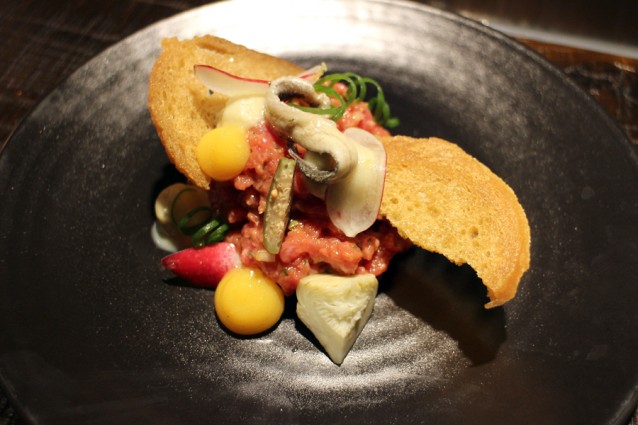 We beginnen met de steak tartare met kapperappels, radijs, sous-vide gegaarde eidooier, artisjokcrème en boquerones (0-20ºC, €13,-). Al in het eerste gerecht proeven we het lef van de keuken: alles is hoog op smaak met veel zuren en een flinke snuf zout.