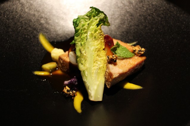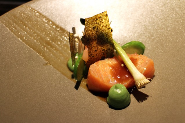 Dan krijgen we een stukje zalm met wakame (zeewiersalade), enoki paddenstoelen, teriyakisaus en gegrilde bosui (40-80ºC, €14,-). Ook hier zijn de smaken vol, fris en de bosui zorgt voor een perfecte balans.