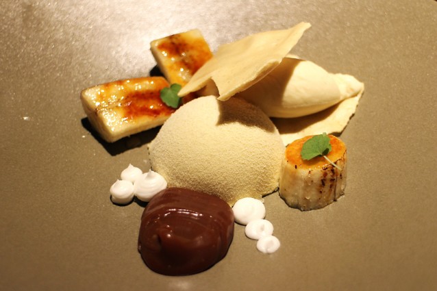 De avond wordt afgesloten met een dessert van gekaramelliseerde banaan, bananencrème, ijs van rum en kokos en caramelfudge (-20-0 graden, €10,-). Het geheel is niet te zwaar, wederom goed in balans, de karamel op de banaan knapperig en gewoonweg gruwelijk lekker.