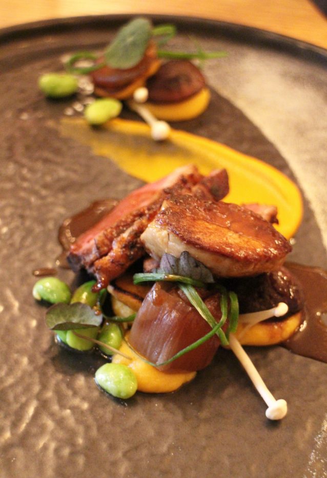 Het hoofdgerecht bestaat uit een eigen versie van Pekingeend: zacht gegaarde eendenborstfilet met stroperige hoisinsaus, eendenlever, boterzachte sjalotten, goddelijke puree van zoete aardappel en een poeder van wasabi.