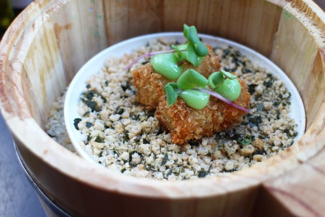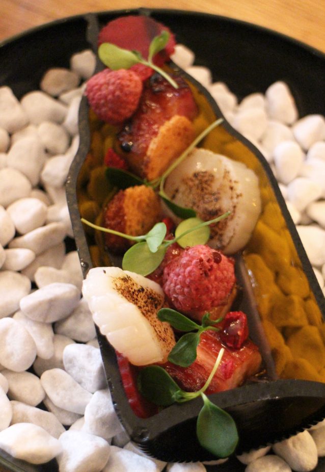 Bij het zien van de eerste oesters en de daarbij geschonken rabarberwijn (inderdaad, wijn gemaakt van alleen… rabarber!) wordt dat gevoel alleen maar bevestigd. Na de combinatie vol zoet, zuur en zilt gaan we verder met een lekkere, maar vrij saaie amuse van gefrituurde sushirijst met wasabimayonaise, nori en cress.