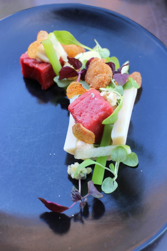 De daarop volgende deconstructed steak tartare met gerookte aardappel, stilton en nuggets van merg is gemaakt van uitstekende ingrediënten, maar mist wederom smaak. Het lijkt bijna alsof de kok zijn zoutpotje is kwijt geraakt en de producten afzonderlijk van elkaar niet op smaak heeft gebracht.