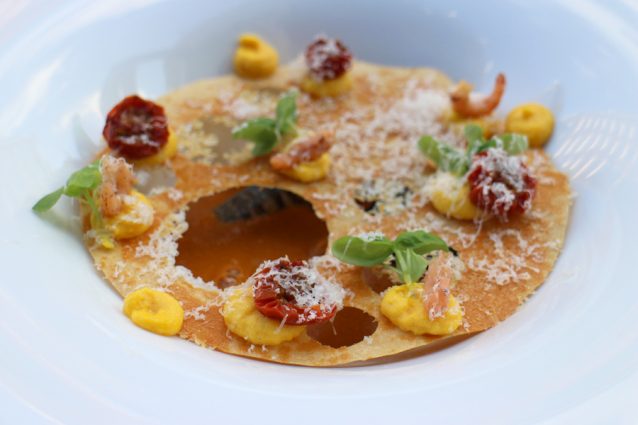De bouillabaisse wordt geserveerd met panharing, een tortellini van inktvisinkt en Gruyère. De klassieker uit Marseille wordt kunstig gepresenteerd (met een krokant ‘dakje’ en heerlijke schaafjes kaas) en is (bijna te) hoog op smaak, maar we worden haast afgeleid door alle toefjes en extra’s.