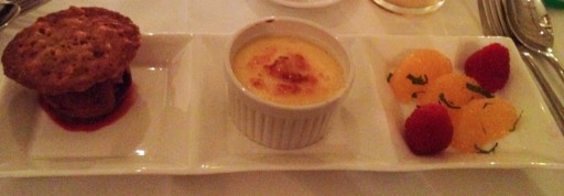Het diner werd afgesloten met een bramensorbet met crème brulee van passievrucht en een beetje fruit. De crème brulee smaakte erg goed en was precies zoet genoeg, terwijl de bramensorbet een tikje zurig was, mooi in balans. Jammer was dat de bramensorbet niet zo goed gedraaid was, er zaten duidelijk ijskristallen in wat het een stuk minder lekker maakte. Daarnaast was het fruit lekker, maar voegde dit weinig toe aan het geheel.