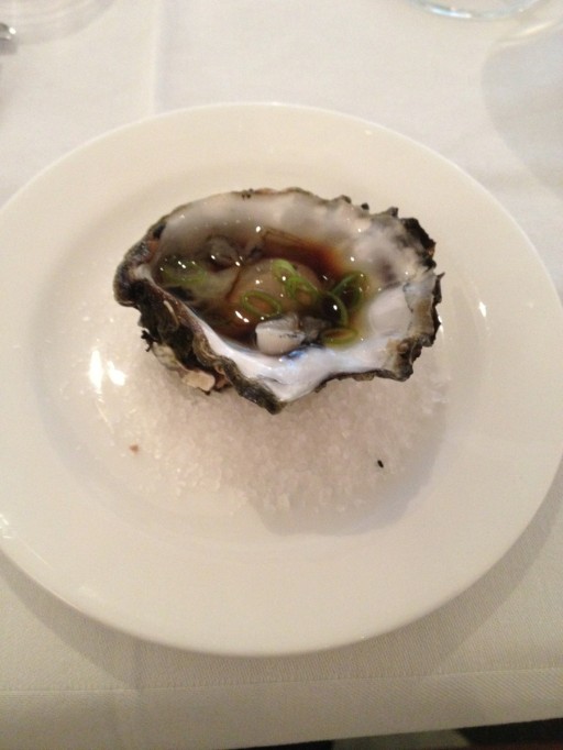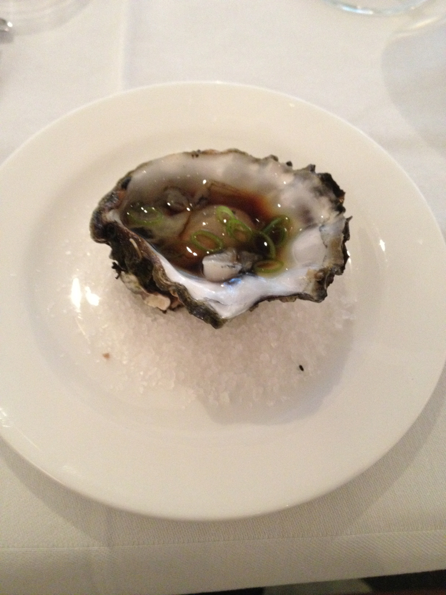 Met een verrukkelijke amuse maken we kennis met de kookkunsten van chefkok Peter Bakker, een oester met soyasaus, wasabi en heerlijk knapperige bosuitjes. De soyasaus en wasabi zijn precies genoeg, eerst proef je de mooie volle, romige smaak van de oester en later pas de wat scherpere smaken van de soya en wasabi. Tot slot proef je de subtiele smaak van de knapperige bosui, we want more!