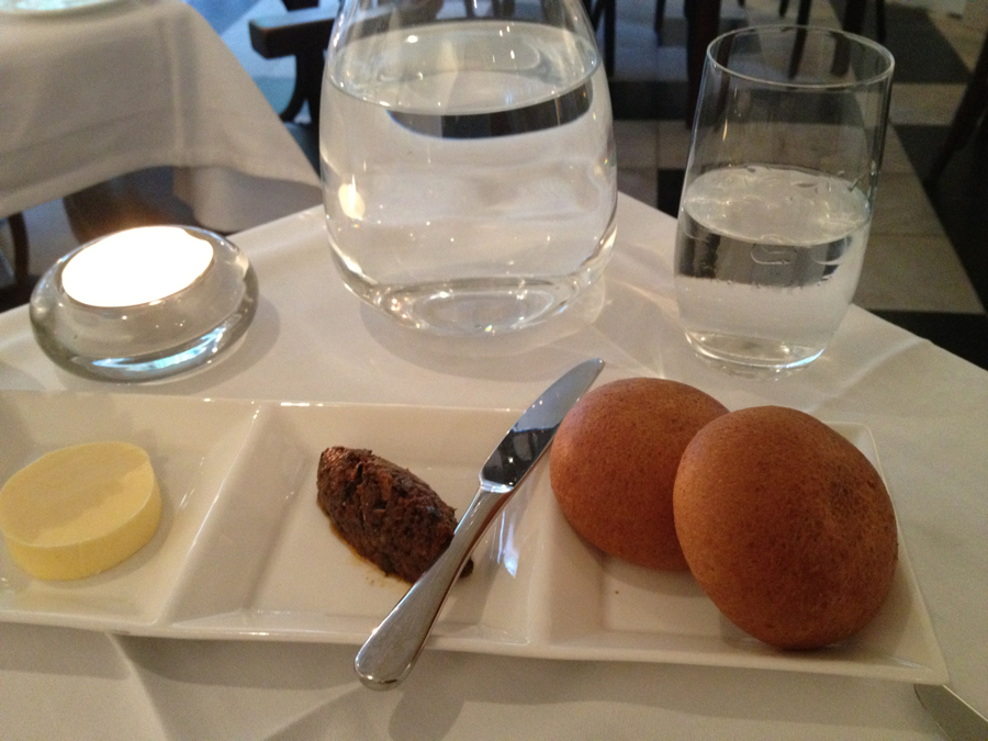 Terwijl we zitten te genieten van ons heerlijke voorgerecht krijgen we een bordje met brood, boter en tapenade. Het brood is warm, zacht, licht zoet en hoewel het volkoren is doet het ons denken aan brioche. De boter is ook van hoog niveau en toen de broodjes op waren, wat snel gebeurde omdat het zó lekker was, werd het gelijk bijgevuld.