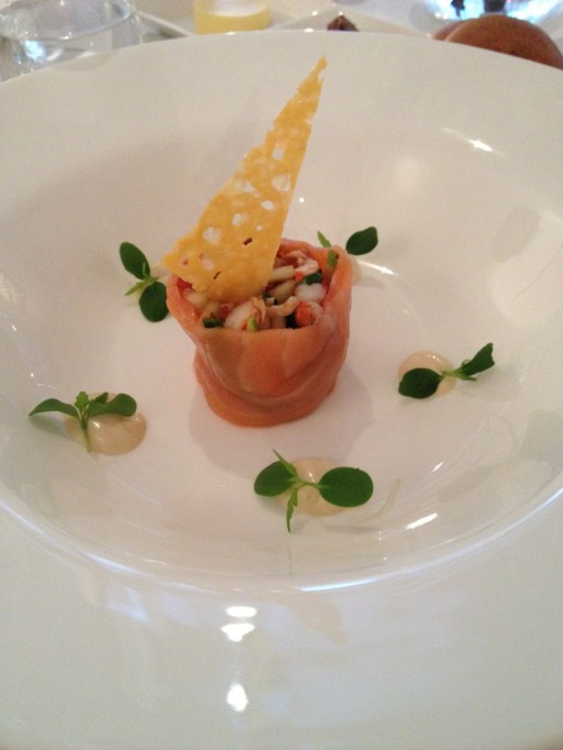 Na de verrukkelijke amuse begint het menu dan echt, de eerste gang arriveert. Canneloni van gerookte zalm met salade van rivierkreeftjes, yum! De maître vertelt ons dat de zalm huisgerookt is. Wel valt ons gelijk op dat van de twee geserveerde borden, de ene portie vele malen groter is; jammer!