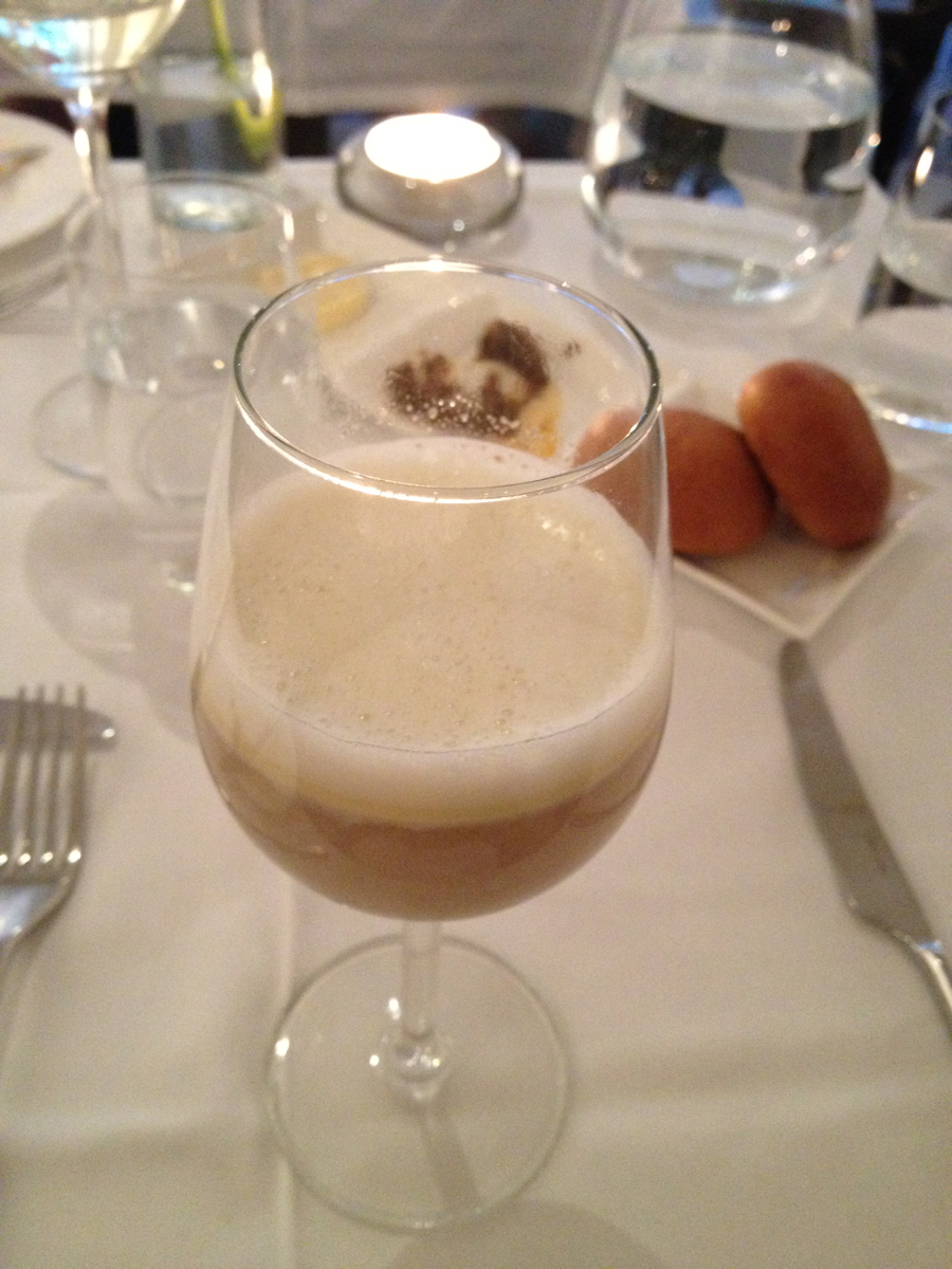 Voordat we het überhaupt geproefd hadden wisten we het al zeker: gang 2, de consomme de boeuff met crème van witte truffel is favoriet, de grote favoriet. Want jeetje, wat ruikt dát lekker! Geserveerd in een wijnglas loopt het water ons in de mond bij het zien en ruiken van de dubbelgetrokken runderbouillon, we kunnen niet wachten met proeven. Gelukkig laat onze neus ons nooit in de steek, het smaakt nog lekkerder (als dat al mogelijk is) dan het ruikt. Wauw!