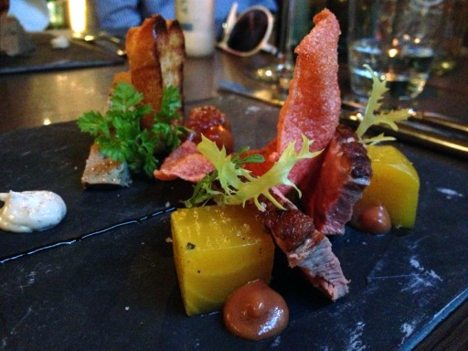 Niet veel later wordt het tussengerecht gebracht: een stukje gebakken watermeloen met feta, pijnboompitjes en oreganovinaigrette. Lekker! Na een kleine pauze gaan we verder met zelfgemaakte kalfspate met gebakken brioche en een chutney van zilveruitjes en rozijntjes. In één woord: heerlijk. Alles past zó goed bij elkaar (die chutney, my god!) dat we bijna vergeten dat er nog iets anders lekkers op het leistenen bordje ligt..