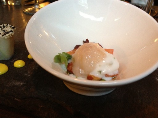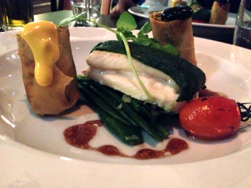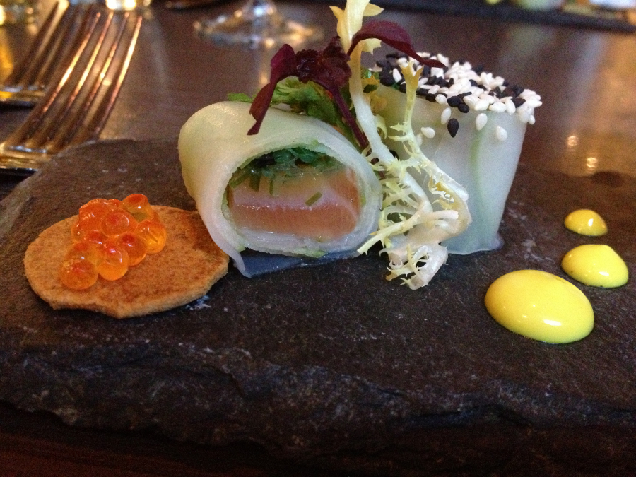 Na niet al te lang wachten verschijnt het eerste plaatje op tafel: cannelloni van rijstvel met gemarineerde zalm, wakame (zeewier) salade, een koekje van wasabi en curry mayonaise. Daarbij wordt in een schattig kommetje Thaise-basilicumsorbet met rauwe langoustine geserveerd en vervolgens een pittige gazpacho bij geschonken. De verschillende smaken zijn afzonderlijk erg lekker, maar of ze helemaal bij elkaar passen..? Dat durven we niet te zeggen.