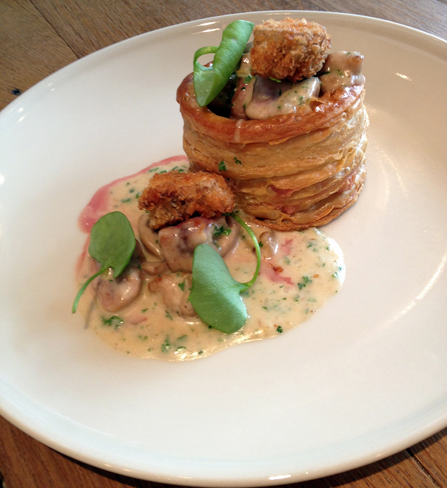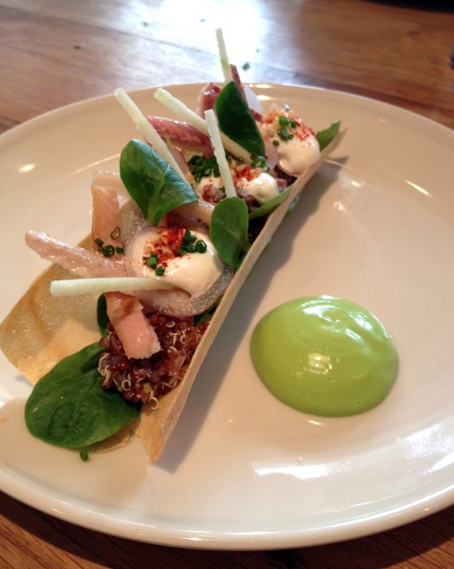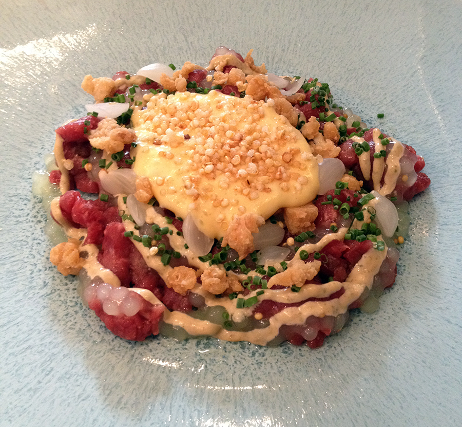 Als eerste proeven we de steak tartare met mosterdschuim en zilveruitjes, en die valt gelijk gelijk in de smaak. Zacht vlees met veel smaken, maar toch simpel en met een lekkere bite.